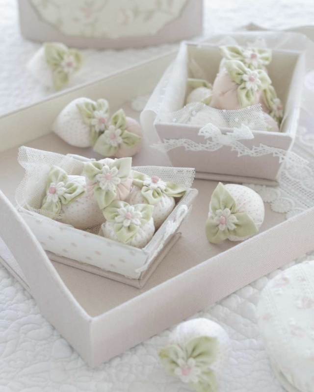 ほんのりピンクのいちごにはビーズを縫い付けて